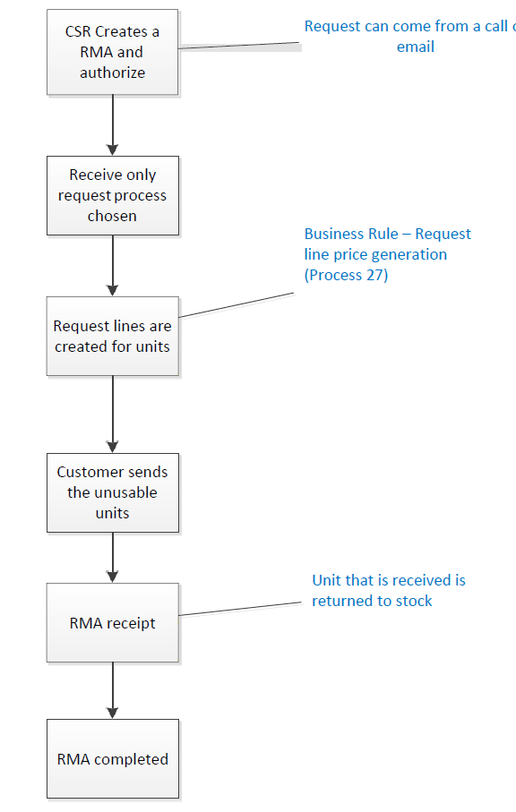 For each process, when all units on a line are shipped or received, that line’s status automatically changes to complete. When all lines on an RMA are complete, the status of the RMA is changed to complete.