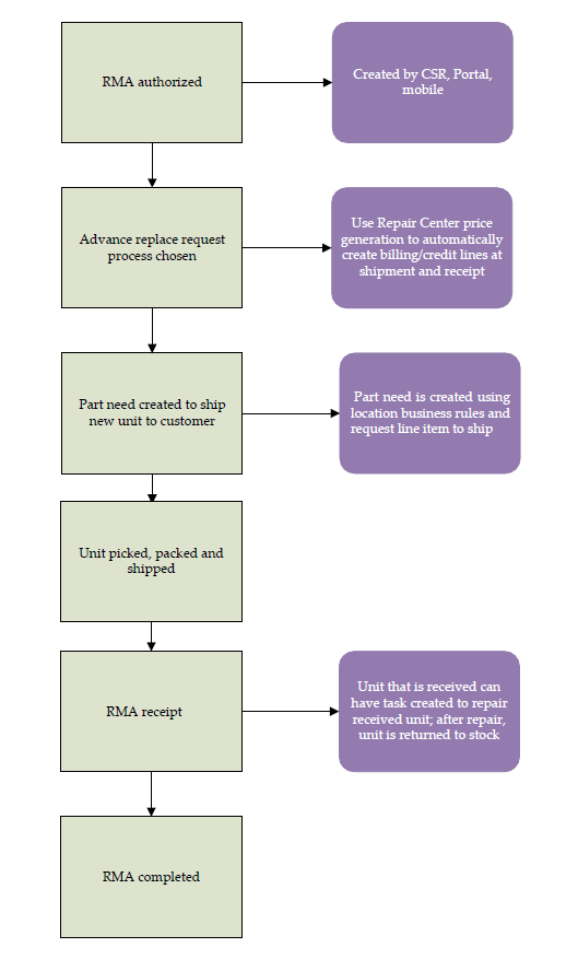 Advanced replacement is used when you want to ship your customer a usable unit before receiving an unusable unit from your customer. You can then repair or dispose of the unusable unit. Advanced replacement enables you to ship a unit before the unusable unit is received.