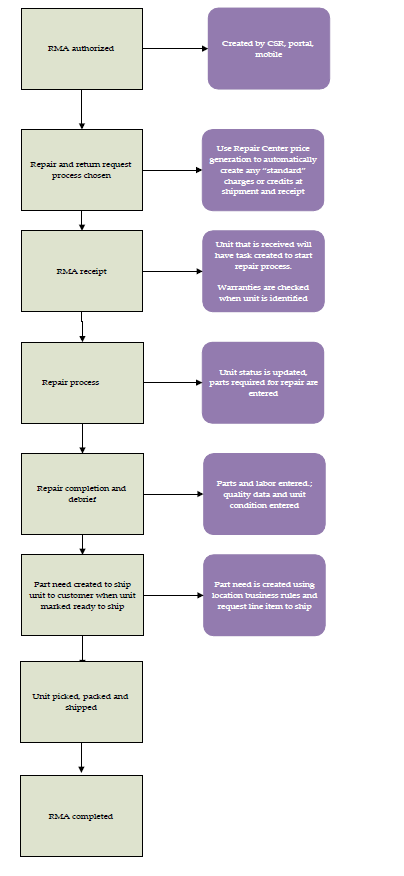 Repair and return is used when you want to receive an unusable unit from your customer, repair it, and return the repaired, usable unit to your customer.